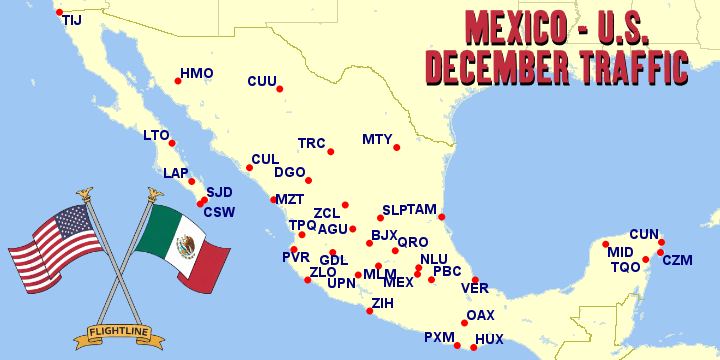 Let’s take a look at traffic from Mexico to the U.S. this December. 37 airports in Mexico have departures to 56 U.S. destinations, with a total of 2,536,409 seats available on 15,519 flights. 22 passenger airlines (a mixture of mainline and regional) offer flights, and 10 cargo airlines are also in the mix. Now, which airports in Mexico have the most seats to the U.S.? I don’t think too many people will be surprised at this list: