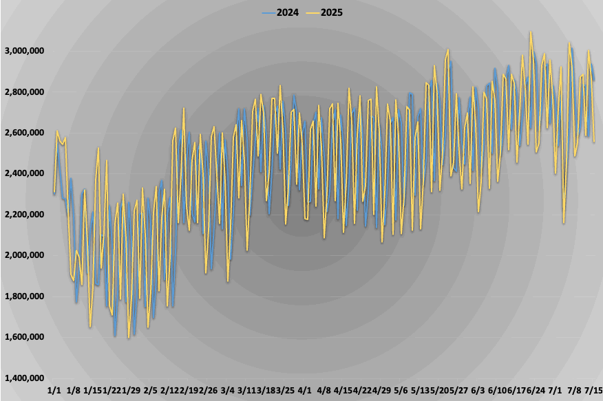 🇺🇸 Daily Passenger Counts at U.S. Airports, 2025 vs. 2024