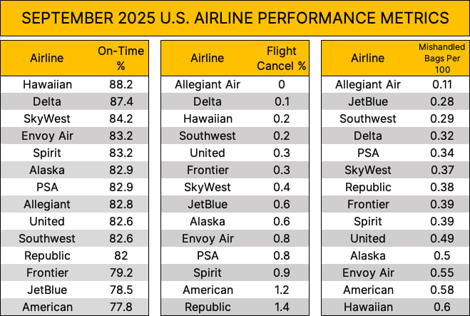 The Bureau of Transportation Statistics (BTS) has released its September 2025 report which covers a variety of U.S. airline performance metrics. Here are the top airlines for on-time performance, the lowest flight cancellation percentages, and how airlines fared handling checked baggage: